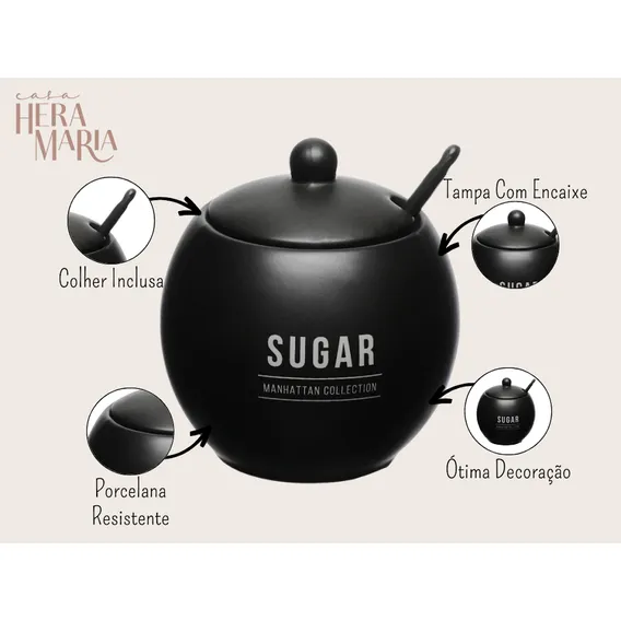 Açucareiro Porcelana Porta Açúcar C/ Colher E Tampa Luxo Cor Açucareiro Preto Sugar