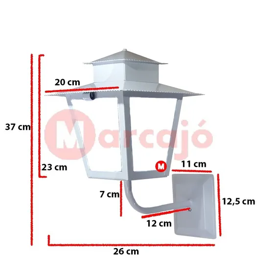 - Dimensões totais da arandela: 37 cm de altura e 26 cm de comprimento