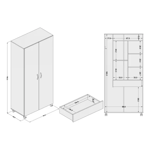 - Dimensões: 1,90 m de altura, 90 cm de largura e 46,5 cm de profundidade