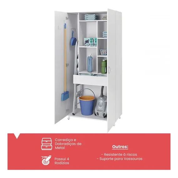 - Suporte para vassoura, facilitando a organização da área de serviço