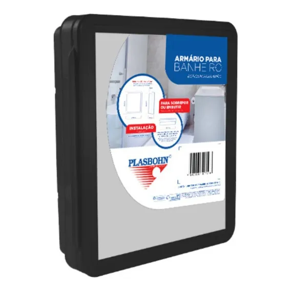 Armário para banheiro embutir ou sobrepor com espelho da Plasbohn, cor preta elegante, 9 cm de profundidade, fácil e limpeza, porta e espelho inclusos. Recursos: - Organiza itens de higiene pessoal - Facilita a rotina diária - Durável e resistente Características: - Cor preta elegante - Profundidade de 9 cm - simples e rápida - Porta e espelho inclusos Especificações: - Material: Plástico - Conteúdo da embalagem: 1 armário de banheiro preto, 4 buchas, 4 parafusos