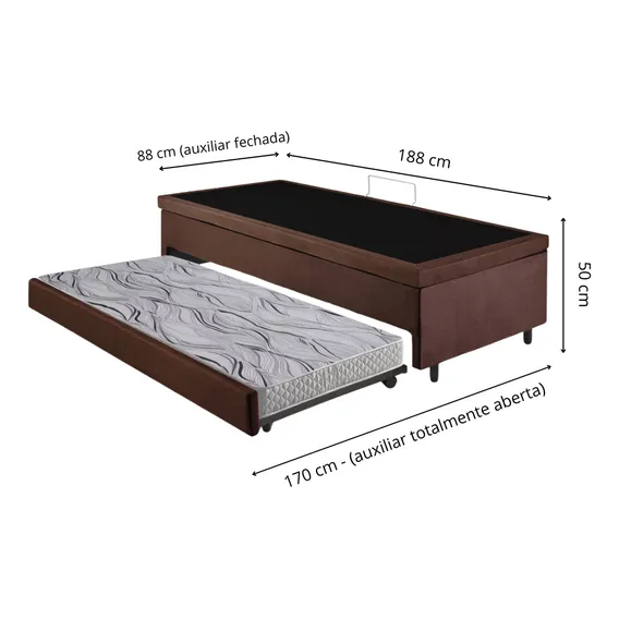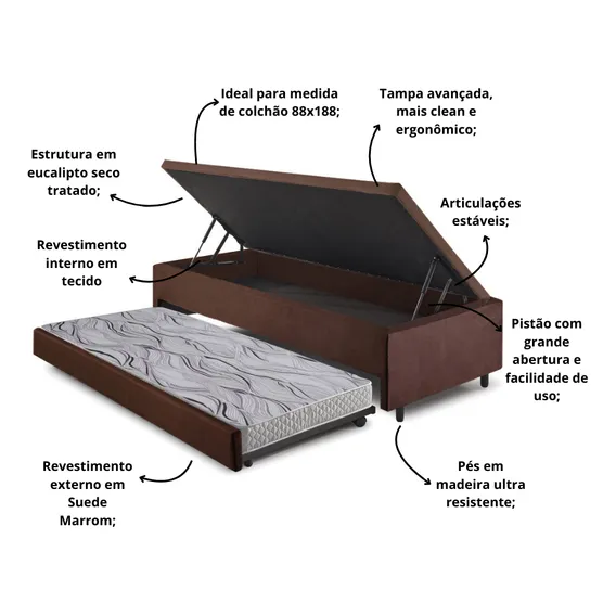 Bicama Baú Solteiro 88x188 Suede Marrom E Colchão Auxiliar