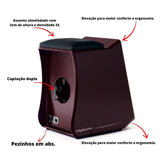 Comemorando 15 anos de história, a maior fabricante de Cajons do Brasil apresenta o FSA Gibão, um cajon premium projetado tanto para profissionais quanto para iniciantes. Este modelo é um verdadeiro investimento em conforto e qualidade, oferecendo uma experiência sonora excepcional e uma estrutura ergonômica avançada. O FSA Gibão é uma peça que você vai querer experimentar para sentir a diferença no seu som e na sua postura durante as gravações.