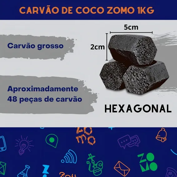 Chega em 5 dias Carvão Para Narguile de Coco Zomo Hexagonal 1kg E 3 Essencias Da Zomo Entrega até Sábado, 25 de outubro de 2025 para TODO o Brasil
