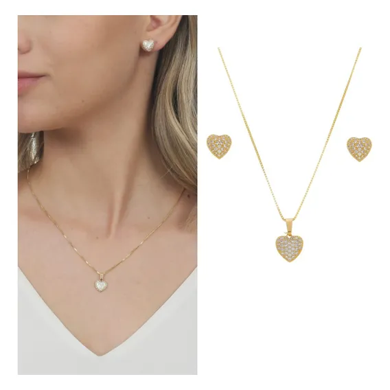 Conjunto Colar Brinco Coração Kit Semi Joia Banhado Ouro 18k Cor Dourado Foto 1
