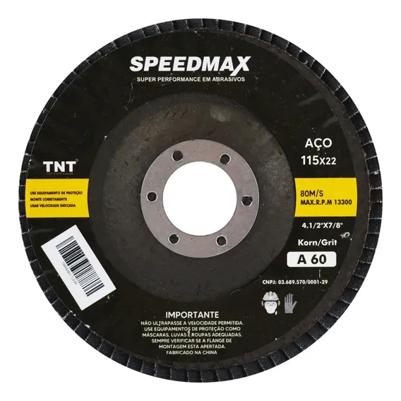 O Disco de Lixa Flap 4.1/2 Grão 60 é uma ferramenta eficiente para lixamento de várias superfícies, ideal para uso em lixadeiras. Fabricado pela Speedmax, ele tem 115 mm de diâmetro e 22,2 mm de diâmetro central, com 6 mm de espessura e 200 peças no kit. Recursos: - Ótimo para lixamento em múltiplas superfícies (alumínio, ferro, inox, madeira e plásticos) - Durabilidade e resistência - 200 peças no kit Características: - Diâmetro: 115 mm - Diâmetro Central: 22,2 mm - Grão: 4.1/2 - Espessura: 6 mm Especificações: - Marca: Speedmax - Quantidade: 200 peças - Condição: Novo