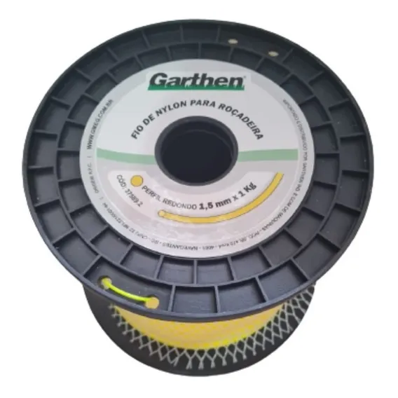Fio de nylon redondo para aparador de grama e roçadeira, diâmetro 1,5mm, 10m de comprimento, embalagem amarela. Recursos: - Resistente - Durável - Fácil de manusear Características: - Diâmetro: 1,5mm - Comprimento: 10m Especificações: - Código da Fabrica: 37589.2 - Marca: Garthen - Cor: Amarelo - Conteúdo da Embalagem: 10m de fio de nylon - Funcionalidade: Cortar grama