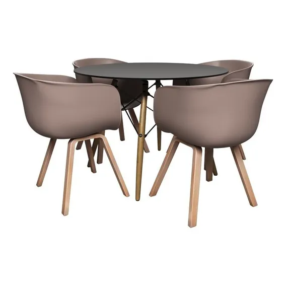 A mesa redonda com 4 cadeiras Angélica/Gustave é perfeita para salas de jantar, com design moderno e acabamento preto/nude. Fácil de limpar e resistente, oferece conforto e estética. Recursos: - 4 cadeiras - Pés em madeira - Contraste agradável Características: - Design versátil - Toque moderno - Material: polipropileno (assento e encosto) e MDF (tampo) Especificações: - Mesa: 120cm x 75cm x 120cm - Cadeira: 54,5cm x 77,5cm x 52,5cm x 45,5cm - Peso suportado: 120kg (cadeira) / 50kg (mesa) - Cor: Nude (cadeiras) / Preto (mesa)