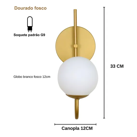 Kit 2 arandelas curva globo 12 jabuticaba dourado fosco Kazaprime