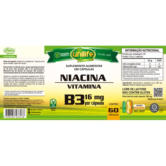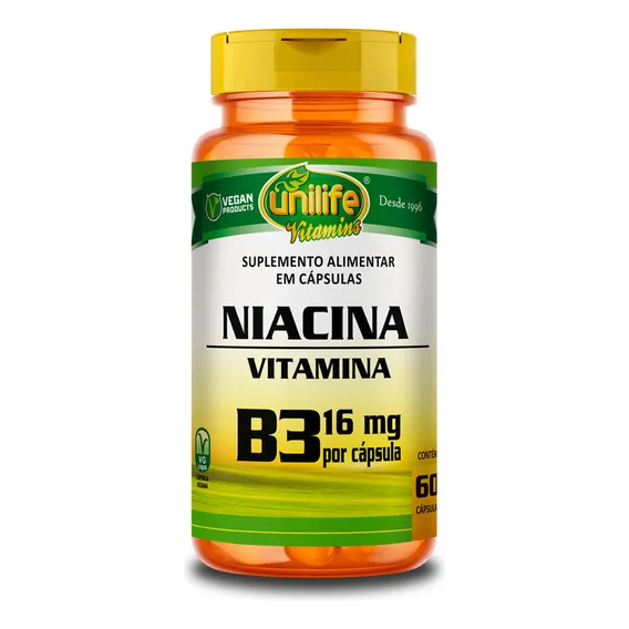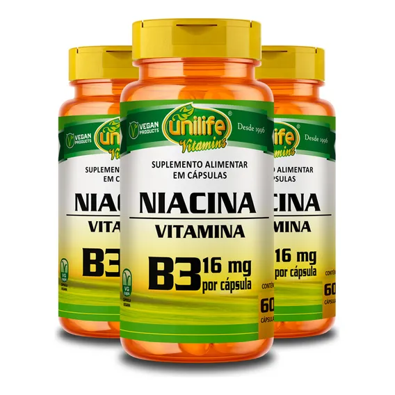 Kit 3 Vitamina B3 Niacina 60 Cápsulas Unilife Sabor Sem Sabor Foto  mini 1 Kit 3 Vitamina B3 Niacina 60 Cápsulas Unilife Sabor Sem Sabor Foto mini  2 Kit 3 Vitamina B3 Niacina 60 Cápsulas Unilife Sabor Sem Sabor Foto mini  3 Kit 3 Vitamina B3 Niacina 60 Cápsulas Unilife Sabor Sem Sabor Foto mini 4