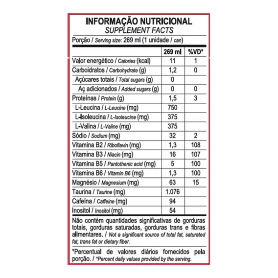 O Max Energy Framboesa 269ML é uma bebida energética ideal para consumo antes ou durante o treino. Ela oferece uma combinação de ingredientes para aumentar a energia e suportar o desempenho físico, incluindo cafeína e taurina. A fórmula também contém vitaminas essenciais e 1,5g de BCAA, além de ser livre de açúcares. Pode ser consumida em diversas situações do cotidiano, como estudo, viagens e atividades físicas, sempre respeitando as recomendações de uso. É importante notar que este produto não é um medicamento e não deve ser excedido em relação à dose diária recomendada. A embalagem de 6 latas garante uma conveniência adicional para os usuários. Recursos: - Fardo de 6 latas para uso contínuo - Consumível tanto antes quanto durante o treino - Ideal para atividades intelectuais e físicas - Adequado para pessoas que buscam energia e concentração - Não causa dependência por ser baixo em cafeína - Contém ingredientes naturais para um consumo seguro - Possui corante caramelo IV para aparência atraente - Conserve no refrigerador para melhor sabor e eficácia - Composto por ingredientes conhecidos por seus benefícios energéticos - Facilidade de consumo com um único sabor: framboesa Características: - Contém cafeína e taurina para estimular o desempenho - Inclui vitaminas B3, B5, B2 e B6 para nutrição - Tem 1,5g de BCAA para ajudar na recuperação muscular - É livre de açúcares - Possui zero glúten - Pode ser consumida em diferentes situações do dia a dia - Embora seja uma bebida energética, ela é adequada para consumo moderado - Fácil de transportar e consumir devido à embalagem em latas - Aromatizada com framboesa para um sabor agradável - Edulcorada com sucralose para manter a qualidade sensorial Especificações: - Volume por lata: 269ML - Quantidade total no fardo: 6 latas - Calorias por lata: 0 calorias - Conteúdo de cafeína por lata: 80mg - Conteúdo de taurina por lata: 500mg - BCAA (L-leucina, L-isoleucina, L-valina) por lata: 1,5g - Vitaminas B3, B5, B2 e B6 por lata: 2mg, 1mg, 0,2mg e 4mg respectivamente - Conservantes: Benzoato de sódio e Sorbato de potássio - Regulador de acidez: Citrato de sódio - Acidulante: Ácido cítrico - Aromatizante: Framboesa - Edulcorante: Sucralose - Não contém glúten - Não contém alérgenos declarados
