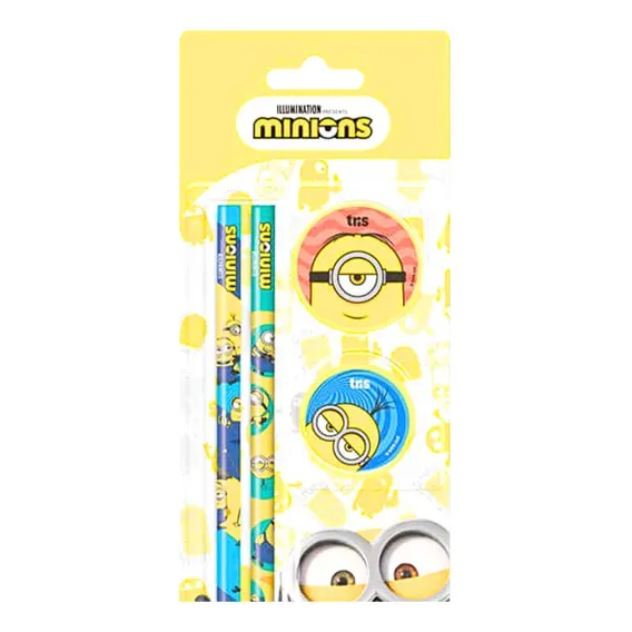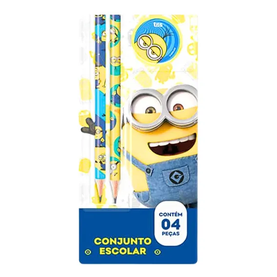 Kit Escolar Tris Minions Com 4 Peças 2 Lápis Apontador E Borracha Conjunto Escolar