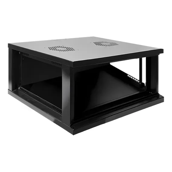 Mini Rack Wall 4U x 570mm, estrutura monobloco soldada em aço SAE 1020, porta frontal removível com visor de acrílico, planos de fixação reguláveis, laterais e teto removíveis com ventilação, base com passagem de cabo, pintura eletrostática a pó texturizada.