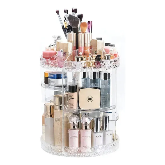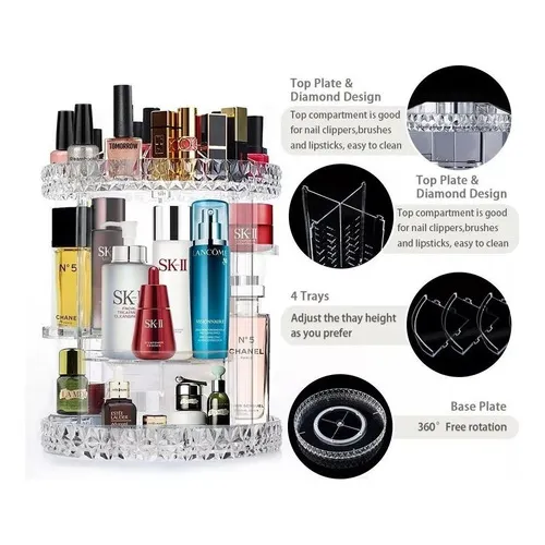 Organizador de maquiagem acrílico giratório 360°, ideal para salões e casas, oferece design moderno e duas gavetas com diversas divisórias para organização dos cosméticos. Recursos: - Projeto giratório 360° - Base rotativa - Bandejas resistentes - Removível e fácil de transportar - Facilidade de limpeza Características: - Design moderno - Duas gavetas - Bandeja com várias divisórias Especificações: - Material: Acrílico resistente - Cor: Transparente - Tamanho: 27cm x 27cm x 35cm - Compatível com produtos pesados - Não muda de forma ou cor após limpeza - Não usar álcool para limpeza