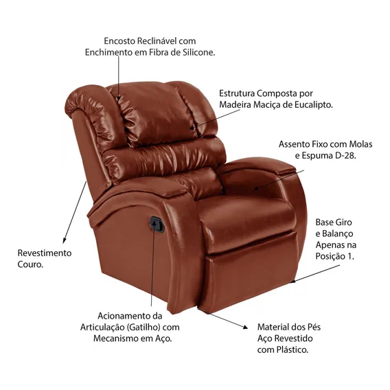 A Poltrona do Papai Gran Belo é uma opção elegante para quem valoriza conforto e estilo. Com madeira maciça de eucalipto, couro (PU) caramelo brilhante e mecanismo giratório e balanço, ela oferece um relaxamento perfeito. Recursos: - Mecanismo em aço com gatilho lateral - Base giratória 360 e balanço apenas na posição fechada - Pés de aço revestidos com plástico Características: - Estrutura de madeira maciça de eucalipto - Assento giro 360 e balanço com molas e espuma D-28 - Encosto reclinável com enchimento em fibra de silicone Especificações: - Largura: 93cm - Altura: 95cm - Profundidade: 96cm - Profundidade aberta: 169cm - Altura do encosto: 62cm - Altura do assento até o chão: 46cm - Peso suportado: 110kg - Peso do produto: 30kg - Conteúdo da embalagem: 1 poltrona - Necessita de montagem: Sim, somente encaixe do encosto - Limpeza recomendada: Pano umedecido