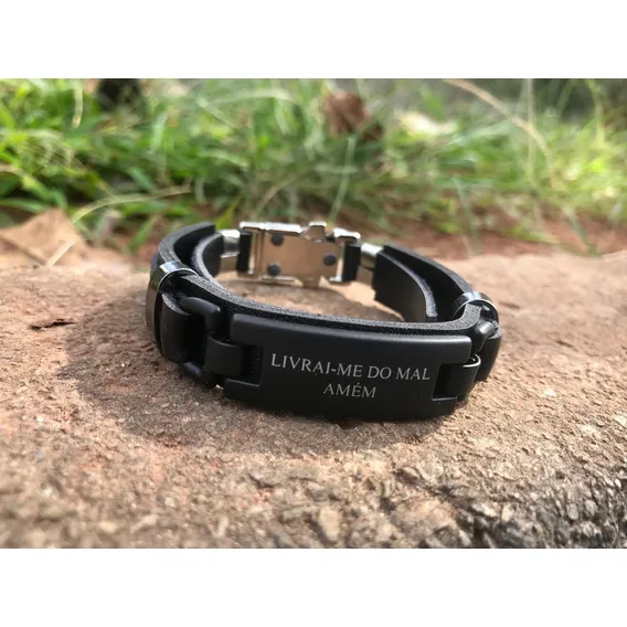 Pulseira De Couro Livrai-me Preto Gospel Trava Masculina Comprimento 19 Diâmetro 2 Cm
