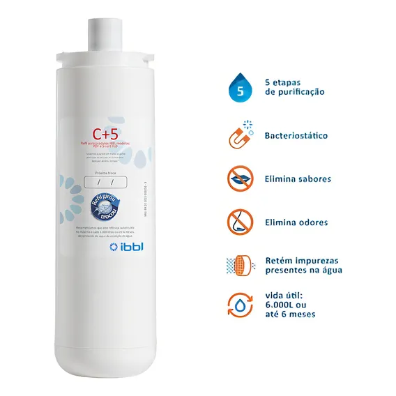 O refil filtro IBBL C+5 para purificadores de água Immaginare, FR600 e outros, oferece água pura e cristalina, eliminando impurezas sólidas e odores, com vida útil de 6 meses ou 6000 litros. Recursos: - fácil - Econômico - Contribui para o meio ambiente Características: - Sistema exclusivo de filtragem - Elimina barro, ferrugem, fungos e algas - Elimina odores e sabores indesejáveis Especificações: - Marca: IBBL - Modelo: C+5 - Vida útil: 6 meses ou 6000 litros - Retenção de partículas: Classe C - Redução de cloro livre: Aprovado - Atende à Norma NBR 16098:2012 e Portaria 394 de 2014 do Inmetro - Para uso em água potável (Portaria 2914 de 2011 do Ministério da Saúde) - Itens inclusos: 1 Filtro Refil IBBL C+5