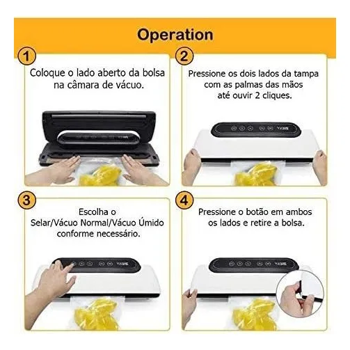 - Incluso: 1 máquina Seladora à Vácuo + sacos, 2 manual de instruções em inglês (simples e intuitivo)