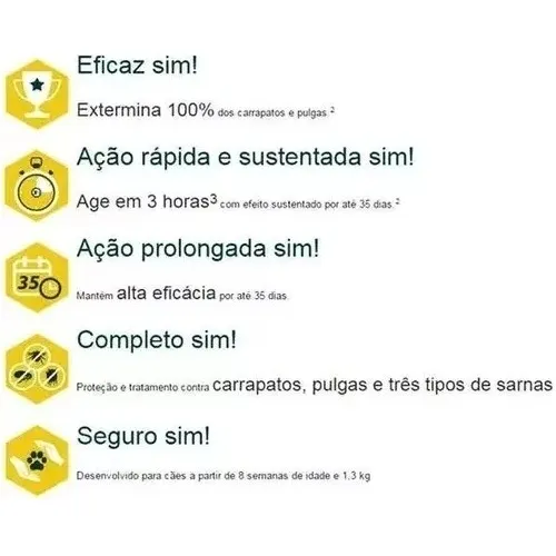 O Simparic 80mg é um medicamento revolucionário desenvolvido pela Zoetis, uma empresa líder no setor de saúde animal, especialmente projetado para proteger os pequenos cães de 1,3 kg a 40 kg. Este medicamento inovador vem em formato de comprimido saboroso e é capaz de eliminar eficazmente carrapatos, pulgas e sarnas, oferecendo proteção de até 35 dias contra esses parasitas perturbadores. Se você é um tutor preocupado com a saúde e bem-estar do seu cãozinho, o Simparic é a solução perfeita para manter o seu pet livre desses incomodativos parasitas, proporcionando-lhe uma vida mais confortável e feliz. Recursos: - Fórmula saborosa que torna a administração fácil e prazerosa para o seu cão; - Eficácia rápida, iniciando o efeito em apenas 3 horas após a aplicação; - Longa duração da ação, mantendo a proteção por até 35 dias; - Formato fácil de administrar, basta dar um simples comprimido; - Facilidade de uso, podendo ser aplicado sem a necessidade de consultas regulares ao veterinário; - Proteção completa contra carrapatos, pulgas e sarnas, proporcionando tranquilidade aos tutores; - Suporte à saúde da pele do seu cão, combatendo a DAPP e melhorando a sua condição geral; - Garantia de segurança e eficácia, sendo um medicamento aprovado e recomendado por profissionais veterinários; Características: - Combate carrapatos e pulgas instantaneamente, garantindo a proteção imediata do seu cãozinho; - Elimina 100% dos parasitas, oferecendo proteção completa durante todo o período de tratamento; - Previne a proliferação de pulgas, matando-as antes que possam produzir ovos; - Controla a dermatite alérgica causada pela picada de pulga (DAPP), melhorando a qualidade de vida do seu pet; - Oferece proteção contra três tipos de sarnas: Sarcópticas, Demodécica e Otodécica, protegendo o seu cão de diversas infestações; - É indicado para cães a partir de 8 semanas de idade e com peso acima de 1,3 kg, garantindo que seja seguro para diferentes fases de crescimento e pesos; - Pode ser usado em cães de portes e raças variados, sem restrições específicas, tornando-o uma opção versátil e acessível para todos os tutores; Especificações: - Dose: 80 mg - Portionamento: 3 comprimidos - Indicação: Para cães a partir de 8 semanas de idade e com peso acima de 1,3 kg - Peso mínimo do cão: 1,3 kg - Peso máximo do cão: 40 kg - Forma de aplicação: Comprimido - Durabilidade da ação: Até 35 dias - Efeito inicial: 3 horas após a administração - Tipos de parasitas controlados: Carrapatos, pulgas e sarnas (Sarcópticas, Demodécica e Otodécica) - Fabricante: Zoetis - Conteúdo da embalagem: Geralmente vêm em caixas com 1, 3 ou 6 unidades, cada unidade contendo 3 comprimidos