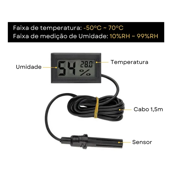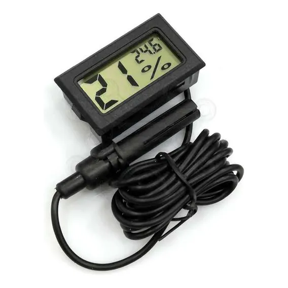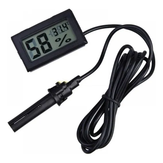 O Termohigr么metro Digital LCD Term么metro Higr么metro Chocadeira 茅 um dispositivo indispens谩vel para quem busca precis茫o e facilidade na medi莽茫o de temperatura e umidade. Este termo-higr么metro foi projetado com uma precis茫o not谩vel, oferecendo uma faixa de medi莽茫o ampla e uma exatid茫o impressionante. Acompanhado por uma bateria inclusa, este equipamento 茅 pr谩tico e econ么mico, ideal para uso em diversos ambientes, desde resid锚ncias at茅 laborat贸rios. Com sua elegante cor preta, ele se integra perfeitamente a qualquer decora莽茫o. Al茅m disso, o cabo de 1 metro proporciona flexibilidade e praticidade ao usu谩rio, permitindo que voc锚 mede a temperatura e a umidade em diferentes partes da sua casa ou local de trabalho. 脡 um aliado valioso para manter o conforto e a qualidade do seu ambiente, garantindo que suas necessidades de controle ambiental sejam atendidas de maneira eficiente e precisa. Recursos: - Medi莽茫o simult芒nea de temperatura e umidade - Medi莽茫o de umidade relativa do ar (RH) com alta precis茫o - Display LCD digital para visualiza莽茫o clara e f谩cil - Medi莽茫o de temperatura interna/externa - Medi莽茫o do ponto de orvalho (dependendo do modelo) - Funciona com baterias LR44 - Cabo de 1 metro para facilitar o uso em locais distantes - Cor preta para harmonizar com qualquer ambiente Caracter铆sticas: - Medi莽茫o precisa de temperatura e umidade - Faixa de temperatura: -50潞C ~ 70潞C - Faixa de medi莽茫o de umidade: 10%RH ~ 99%RH - Exatid茫o da umidade: 5% - Display LCD de alta resolu莽茫o - Cor: Preto - Bateria inclusa - Tens茫o de funcionamento: 1,5V (baterias LR44) - Dimens玫es compactas: 48x28,5x15,2 mm - Cabo de 1 metro para maior flexibilidade de uso Especifica莽玫es: - Faixa de temperatura: -50潞C ~ 70潞C - Faixa de medi莽茫o de umidade: 10%RH ~ 99%RH - Exatid茫o da umidade: 5% - Umidade display resolu莽茫o: 1%RH - Precis茫o da temperatura: 5% - Tens茫o de funcionamento: 1,5V (baterias LR44) - Dimens茫o: 48x28,5x15,2 mm - Dimens茫o LCD: 40x22,5 mm - Cabo: 1 metro - Cor: Preto - Incluso: Bateria