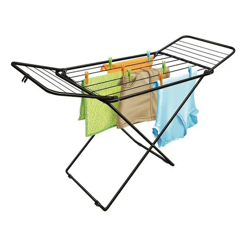 Varal robusto em aço pintado a epóxi, com acabamentos em polipropileno, ideal para apartamentos, viagens e lavanderias pequenas. Fácil de dobrar e transportar, suporta até 16,5kg de roupas. Recursos: - Abas para melhor armazenamento de roupas - Suporta até 16,5kg de roupas úmidas - Equivale a 8,48m de varal Características: - Varal de aço com acabamento em plástico - Fechado e ocupa pouco espaço - Robusto e durável - Pode ser transportado facilmente Especificações: - Cor: Preto - Capacidade: Até 16,5kg de roupas úmidas